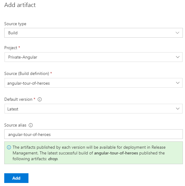 Add artifactand configure the options to point to your Build project -