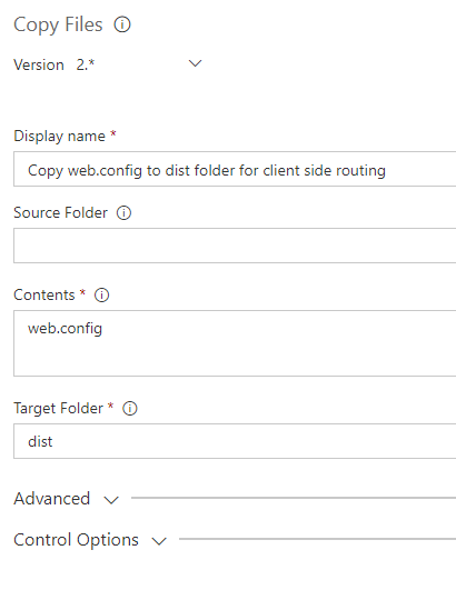 In order to enable client side routing on the Azure App Service, we’ll need to copy the web.config file into the distribution folder for packaging. Client Side Routing