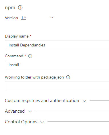 Select Add Task and add a new npm task. This step will install the npm dependancies of the project.