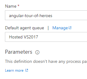 Click on Process and ensure that the Default agent queue is set to Hosted VS2017. This will help prevent issues later on with PhantomJS and how it resolves the npm dependancy as documented here