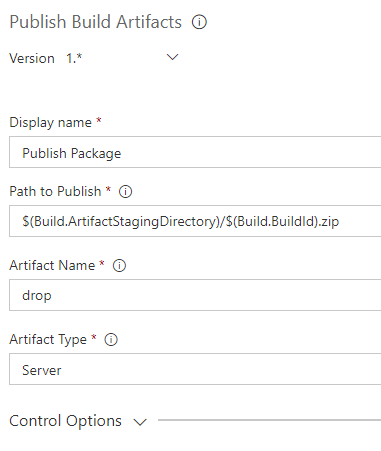 Select Add Task and add a new Publish Build Artifacts. This step will publish the package that was just created as a build artifact. This will then be consumed by the Release definition that we shall create.